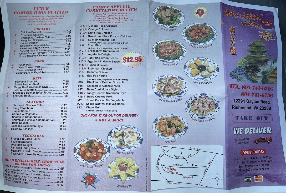 Welcome to City Lights of China, a captivating Chinese restaurant located at 12391 Gayton Rd, Henrico, VA. Here, you’ll discover a menu that perfectly balances traditional flavors with modern interpretations. From the spicy Twice Cooked Pork to the aromatic Moo Shu Pork, every dish highlights the kitchen's commitment to freshness and authenticity.